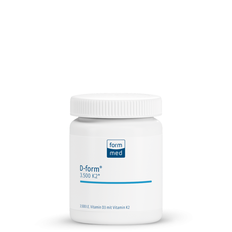 D-form® 3.500 K2+ ist mit der Dosierung von 3.500 I. E. meine Empfehlung, wenn Sie einen nachgewiesenen leichten Mangel langsam ausgleichen möchten. Die enthaltene Pantothensäure unterstützt den normalen Vitamin-D-Stoffwechsel. Für das ergänzende Vitamin K2 verwendet FormMed MK-7 (all-trans), die Unterform mit der höchsten Bioverfügbarkeit.