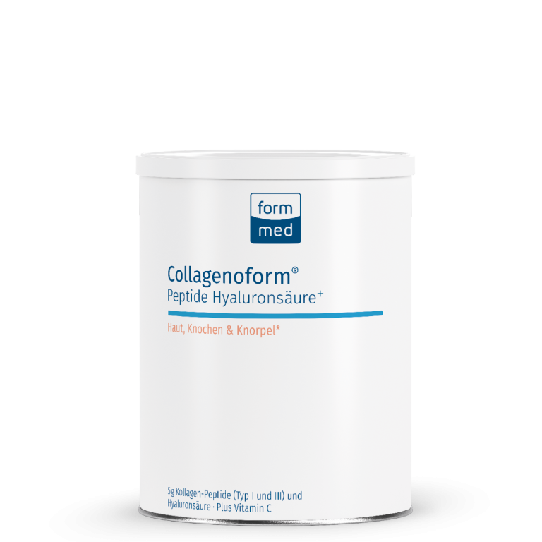 Collagenoform® Peptide Hyaluronsäure+ enthält Kollagenhydrolysat, das sehr schonend gewonnen wird und besonders viel L-Prolin und Hydroxyprolin enthält. Ergänzt ist das Präparat in der gewohnt hohen FormMed Qualität um oral absorbierbare Hyaluronsäure. Für eine normale Funktion der Haut, des Knochens und Knorpels (z. B. der Gelenke) enthält es darüber hinaus Vitamin C.