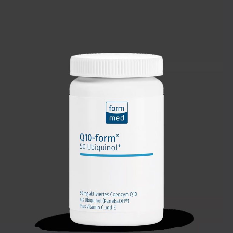 Q10-form® 50 Ubiquinol+ enthält Ubiquinol, die bereits aktivierte Form von Coenzym Q10. Das Präparat ist daher insbesondere im Alter zu empfehlen, da die Fähigkeit des Körpers zur Umwandlung von Ubiquinon zu Ubiquinol dann sinkt. Die patentierte Rohware von Kaneka (KanekaQH®) ist besonders hochwertig – typisch für die Premium-Qualität von FormMed.
